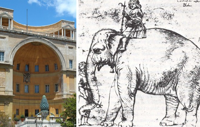 Cortille della Pigna (left) and Hanno the elephant, a gift for Pope Leo X from King Manuel I of Portugal (right)