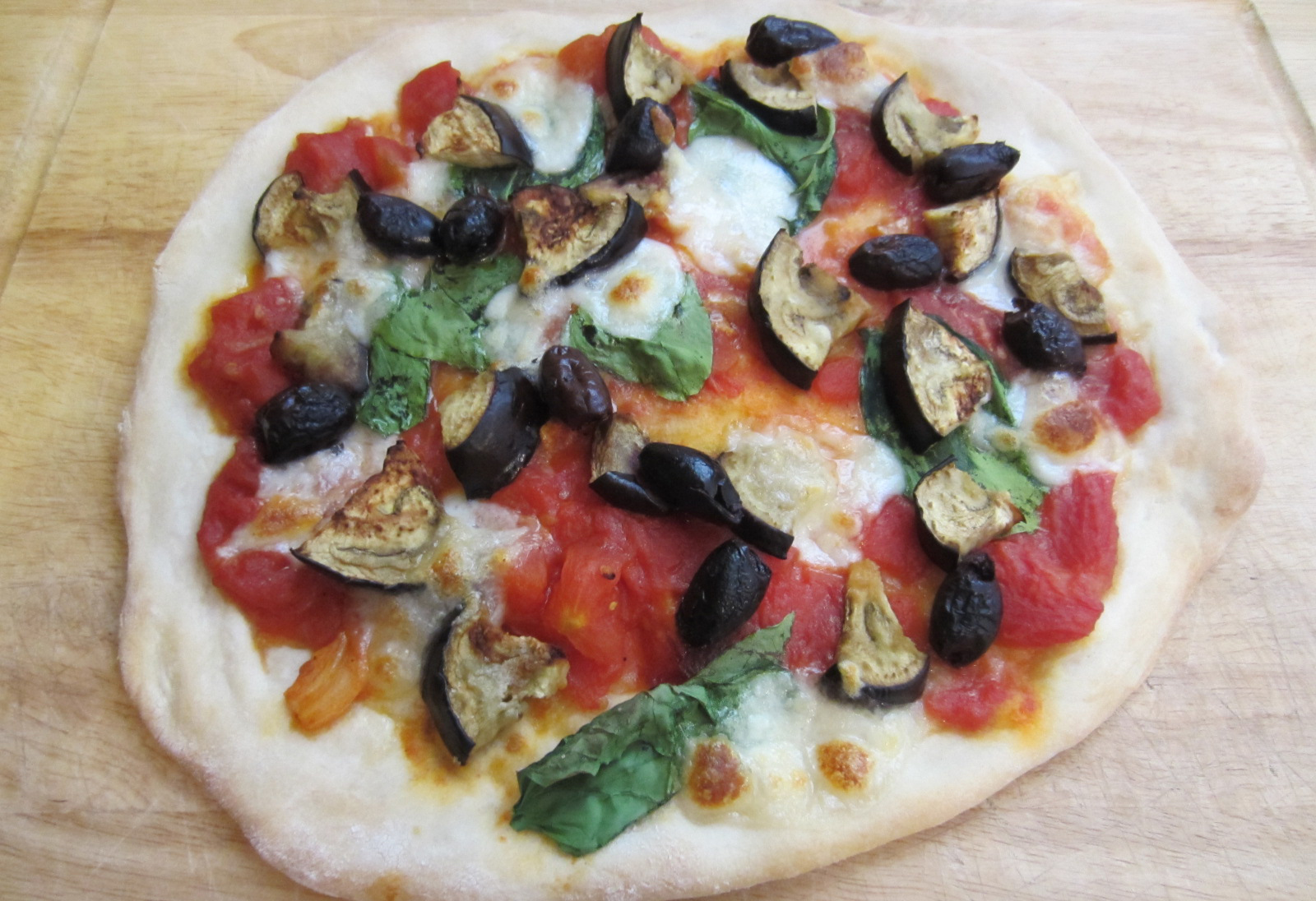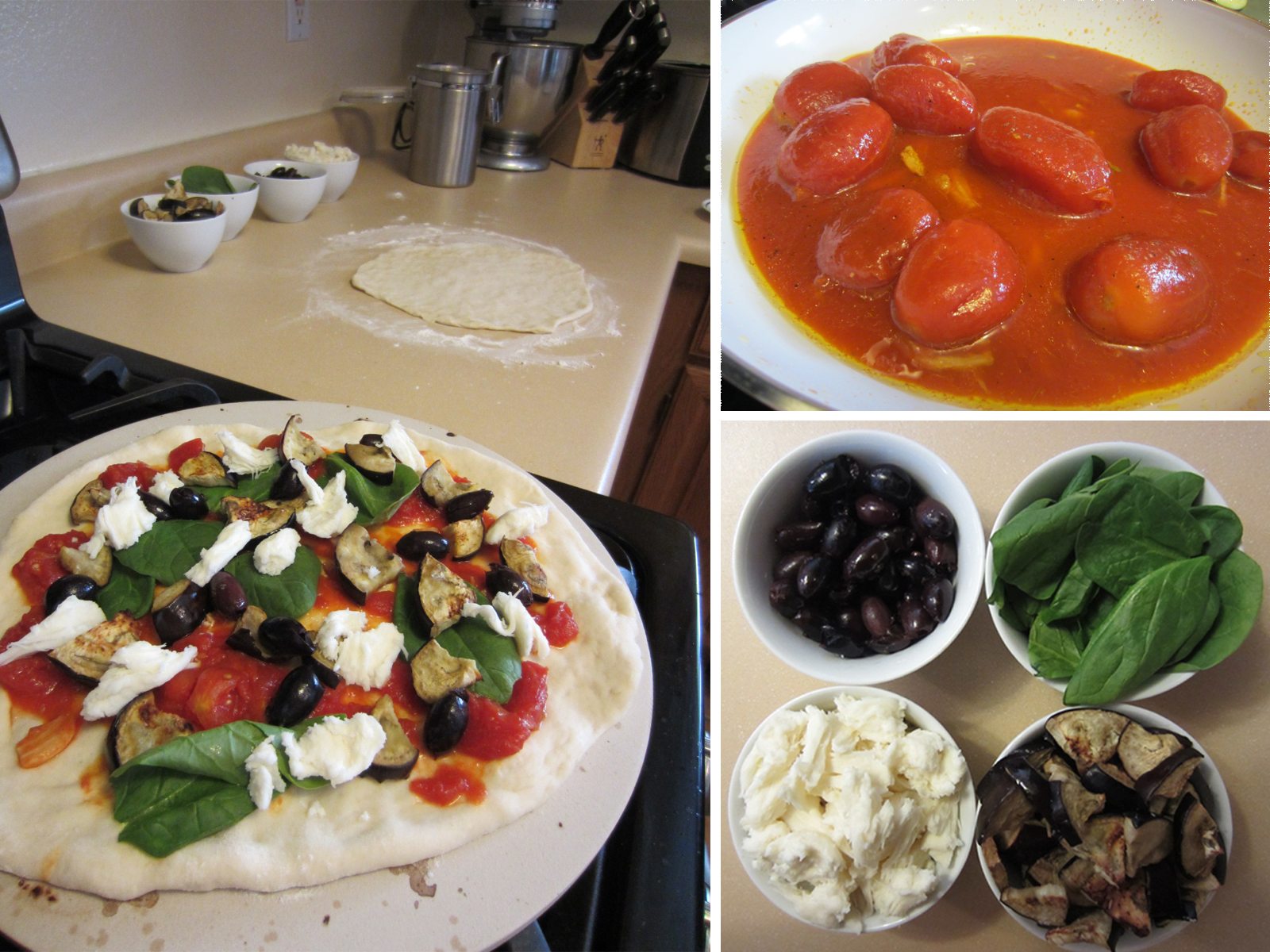 Traveling to Italy has caused me to develop an unwavering appreciation for thin crust pizza cooked in a wood-fired oven, so I strive to make a nice, thin crust at home too.  In terms of sauce, every family no doubt has their own special recipe (I know my mom does), but this one is both simple and versatile, especially when you don’t have time to let it stew all day.  And for my favorite part, the toppings, I always start with a ball of fresh mozzarella followed by an assortment of other things like roasted eggplant, artichoke hearts, Kalamata olives, fresh spinach, etc.  You get the idea.  :)