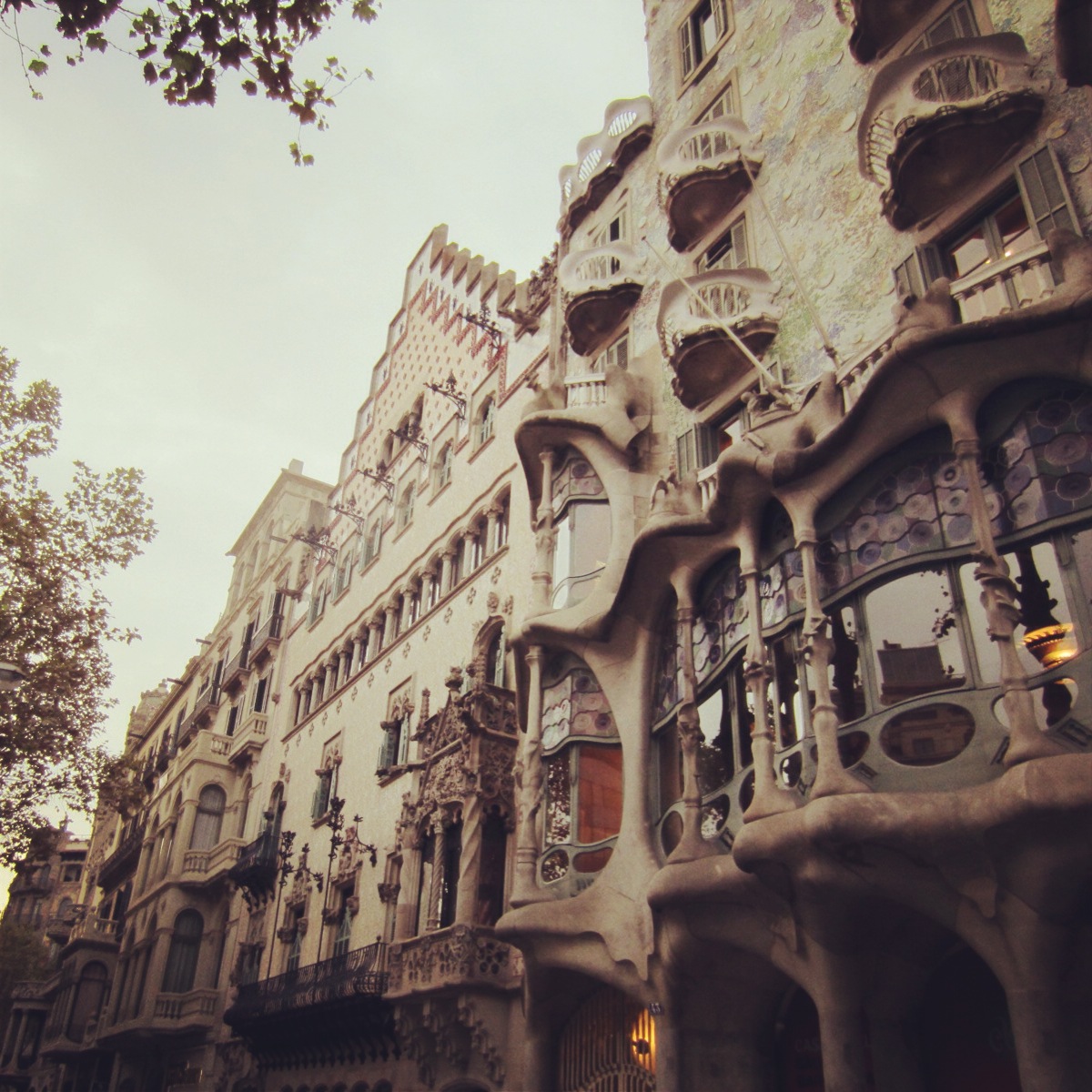 Starting with Casa Batlló at #43 (another Gaudi work), this house features a playful dragon-like roofline and mosaic tile façade that looks like something right out of a Monet water lilies painting.  Next is Casa Amatller at #41, which was designed by Josep Puig i Cadafalch for a chocolatier and his family and coincidentally resembles a gingerbread house.  Its façade evokes Moorish design elements, and if you look closely you’ll notice the letter “A” woven throughout the design, including its pointy roof.