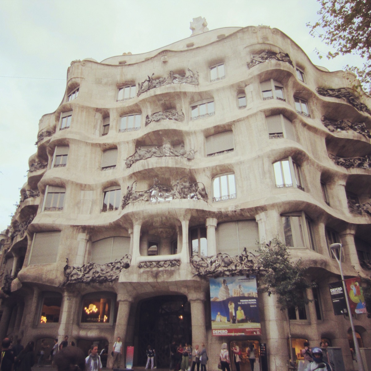 After about a half-hour walk we reached Gaudí’s iconic Casa Milà. Nicknamed La Pedrera (meaning “the quarry”), its unmistakable wavy stone exterior with wrought iron balconies sort of reminds me of a cliff dwelling.  Built from 1906-1912 (while Gaudí was also working on Sagrada Família and Park Güell), Casa Milà was originally designed as a middle-class apartment building to anchor the Passeig de Gràcia neighborhood in the up-and-coming Eixample.