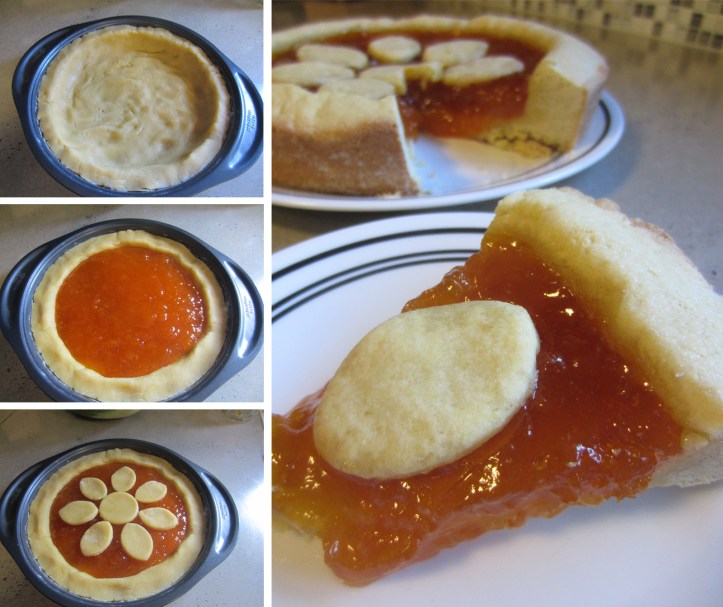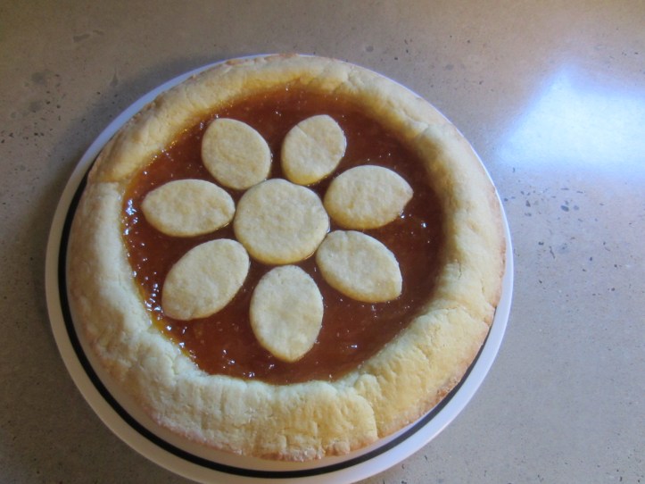 - Pour apricot preserves into the middle of the crust and smooth out to form an even layer, pushing down the sides of the crust if necessary. Decorate the top of the cake with dough shapes.