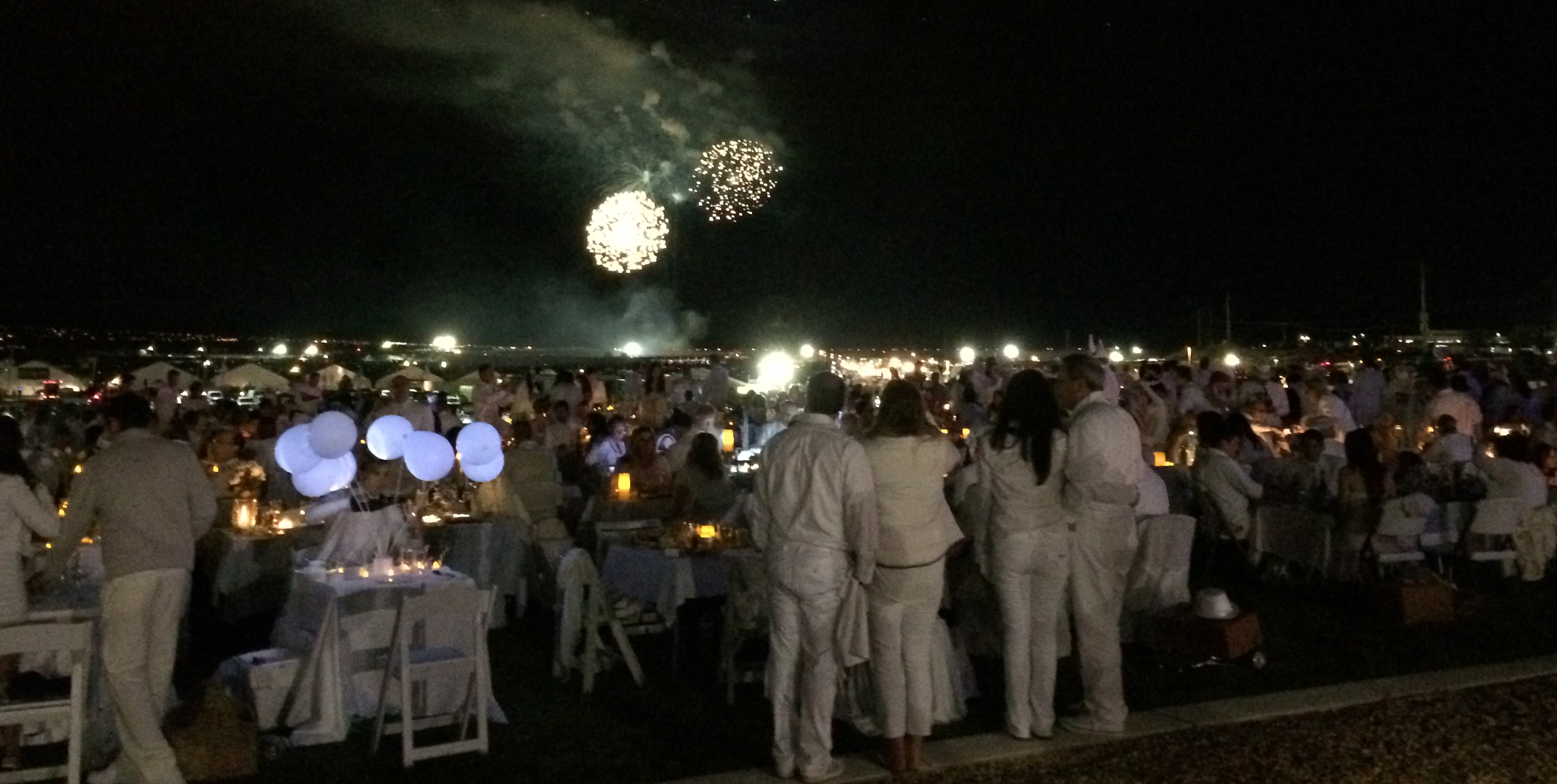 The city’s annual Balloon Fiesta is already a sight to be seen (and one of the most photographed events in the world), but last night’s Dîner en Blanc took it to a whole new level. Under cloudy skies and a firework display in the background, each couple set their table with white linens, glassware, elaborate centerpieces and plates for their gourmet meal. The rows of tables were capped with luminarias, a uniquely-Albuquerque touch.