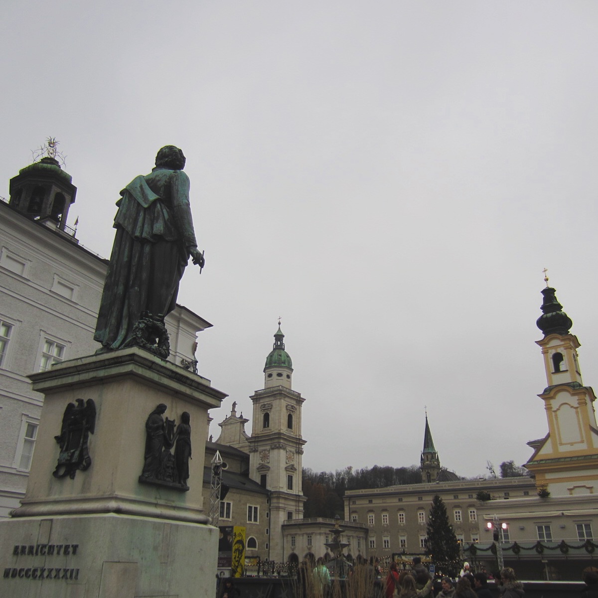 After leaving the gardens we walked along the Salzach River and crossed over to the Altstadt, Salzburg’s Old Town. Most sights in the heart of historic Salzburg are easy to explore on foot since this area has been completely pedestrianized. While it was transformed with Christmas markets when we were there, it’s also home to a handful of interesting sights scattered throughout its interconnected squares. We began at Mozartplatz, named after Salzburg’s resident son Wolfgang Amadeus Mozart. Here you’ll find a statue paying homage to the composer, which was erected in the square in 1842 to commemorate the 50th anniversary of his death.