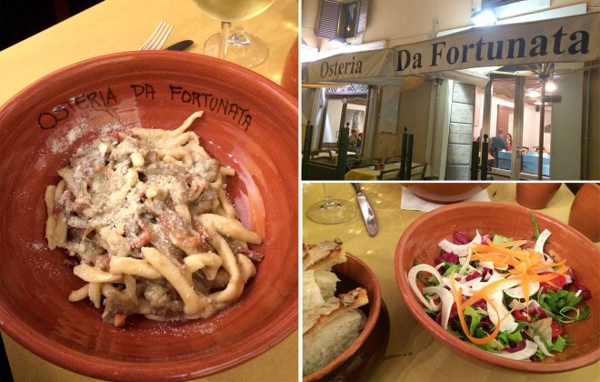 Also nearby just north of Campo dei Fiore is Osteria da Fortunata, a restaurant we ate at with some friends that we met a few days earlier during a cooking class in Florence (more on that soon!).  There you’ll find “Mamma” sitting at a table in the front window facing the street, hand rolling and cutting pasta, perhaps to intentionally draw people in (it worked).  We had an interesting experience to say the least at this traditional restaurant, where our jovial waiter insisted on bringing us what he thought was good that night rather than what we attempted to order.  This included a few handmade pasta dishes and petto di vitella alla fornara (veal with roasted potatoes) and what we later found out was coda alla vaccinara (oxtail stew).  Oxtail is something that I wouldn’t have normally eaten but since we didn’t know what it was at the time, we devoured the meat, which was so tender that it fell apart when it met your fork, and soaked up the remaining tomato sauce with crusty bread.  When in Rome.