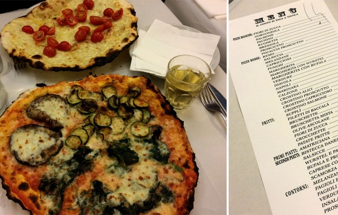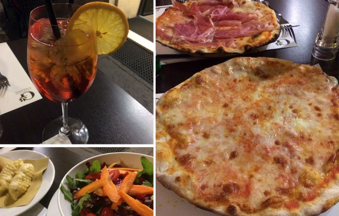 On my most recent trip to Rome, I was looking for someplace that was equally as good as Da Remo but slightly more upscale since my husband and I were celebrating our anniversary.  The same friend also recommended Emma Pizzeria near Campo dei Fiore.  The restaurant’s contemporary black, white and red decor felt upper chic but not too pretentious thanks to the exposed stone walls throughout, but since the weather was nice we requested a table outside.  We started our meal with Aperol Spritz, an aperitivo that I find synonymous with warm summer nights in Rome, followed by an assortment of antipasti including supplì (stuffed rice balls) and fiore di zucca (zucchini flowers with mozzarella) and an inslata mista.  Then the pizza arrived, which lived up to our expectations with its thin, crispy crust and perfectly melted mozzarella cheese.  You’ll also find a decent assortment of primi pasta dishes and secondi meat dishes on Emma’s menu, along with other sides, desserts and spirits, so there’s definitely reason for return visits.
