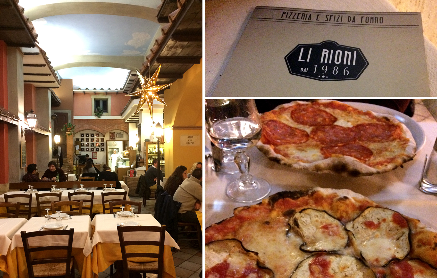 While many first time visitors to Rome vie to stay near popular spots like the Colosseum, it’s often hard to find good food in such heavily-touristed areas.  Yet just 3 blocks from the Colosseum we found a little gem in Li Rioni.  This classic neighborhood restaurant serves up Roman-style appetizers (think fried rice balls and zucchini flowers) and wood-fired pizzas that were both crispy and delicious.  It felt like a place locals would go (the table text to us was a family celebrating a birthday) and seems to be run by a father and son team (although I can’t confirm that).  You’ll find both outside and inside seating, the latter designed to look as if you’ve been dropped in the middle of a street scene with a brightly painted sky-blue ceiling and working lamp posts, creating a pleasant and casual environment that is matched with Li Rioni’s unrushed service.  My order has become somewhat formulaic – house wine, insalata mista and a pizza topped with some sort of vegetables or the traditional Margherita – which did not disappoint at Li Rioni.
