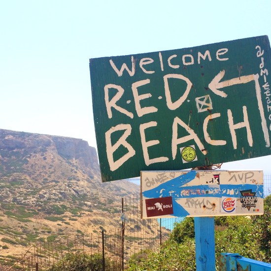 Helpful hints: Make sure you have good sturdy shoes (no flip flops) since the path to the Red Beach is relatively steep with loose rocks. The beach is more secluded, which translates into a more laid back vibe and potentially more nudism.