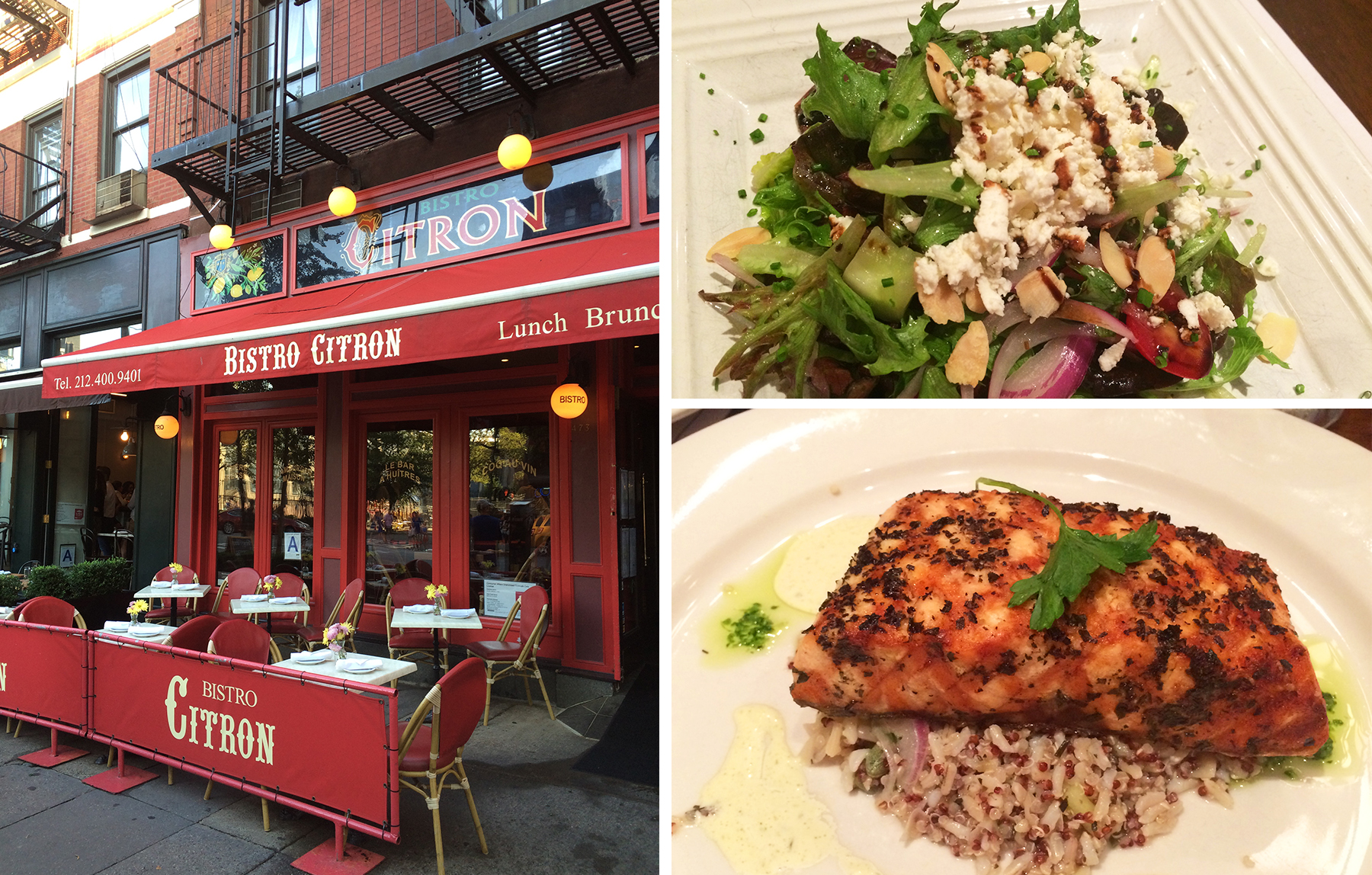 Our time in New York conveniently fell during French Restaurant Week, and in honor of Bastille Day we jumped right in and took advantage of the special menus available at French establishments around the city. At Bistro Citron on the Upper West Side we were enthusiastically greeted by the manager and seated at a cozy corner table. The restaurant oozed with bistro charm, from black and white tile on the floor to art nouveau décor adorning the walls. The prix fixe Restaurant Week menu included an appetizer, entrée and choice of wine or beer, from which I started out with a baby green salad and my husband the charcuterie and cheese platter. We followed this with the pan roasted pork tenderloin and the herbed grilled salmon, both delicious and true to the restaurant’s French-American cuisine.
