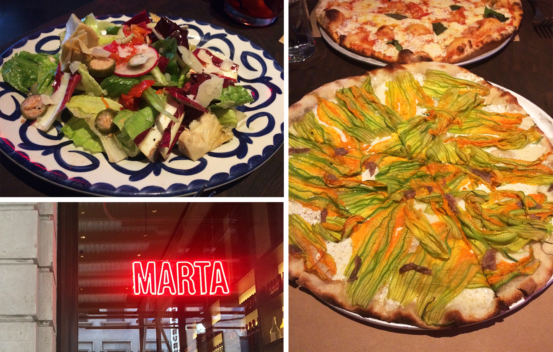 We started off with the Marta Mista salad (which was a little on the small side for 2 people to share) and ordered 2 different pizzas, a traditional Margherita from the pizza rosse selection and the Fiori di Zucca from the piazza bianche section. Both did not disappoint, with cracker-thin, crispy crust and just the right amount of marinara, mozzarella and basil on one, and the perfect marriage of the salty anchovies, mozzarella and bright yellow zucchini flowers on the other. Delizioso. One note, the prices at Marta are a little on the high side, but it recently became a non-tipping restaurant with hospitality included in the costs you see on the menu, which makes it much more reasonable. It’s definitely a place I would return again for a special (pizza) occasion.