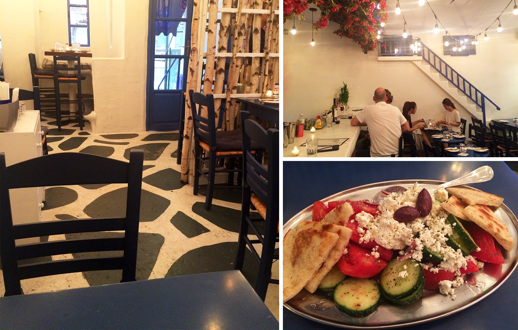 Switching gears from Rome to Mykonos, Souvlaki GR is an unexpected little gem tucked away in Midtown (with another location on the Lower East Side and a food truck around the city during the week). Step inside through the unassuming blue and white threshold and you’ll feel as if you’ve been transported directly to the famous Greek island thanks to the whitewashed walls and cobblestone streets that emulate the narrow lanes that Mykonos is known for, with more blue accents, pink bougainvillea flowers and lights strung throughout. A Greek family-owned restaurant (with predominantly Greek staff working the night we were there), Souvlaki GR proudly serves up a broad menu of authentic cuisine, right down to the imported beer and table salt.