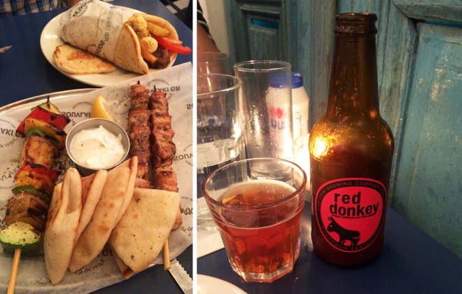With so many options to choose from, including many of our “favorite” dishes from our time in Greece last year, it was hard to decide what to order. We started with a traditional Greek salad (Horiatiki) to share along with Greek meatballs (Keftedes) served with tzatziki sauce, chicken and vegetable skewers and the SGR Souvlaki pita filled with beef, tomatoes, red onions, feta, fries and a slightly spicy Tyrokafteri spread. It was probably as close to the “real thing” as we will find in the States and was almost too much food, leaving no room for dessert or an iced Nescafe Frappé, which is reason enough for me to return.