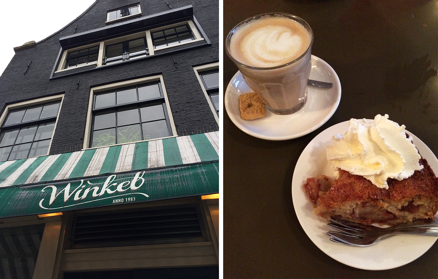 For another Dutch treat, a visit to Winkle 43 should be mandatory.  This little café is famous for its homemade apple pie, which is more cakey in consistency than others we had tried, just the right amount of sweet and topped with a dollop of real whipped cream for good measure.  So how did we know it was worth the indulgence?  By the crowd of people overflowing onto the street, waiting for a coveted table to open up in the small, cozy space.  We were sat next to the dumbwaiter and watched fresh-baked pie after pie emerge, plotting how we could walk out with one or two without anyone noticing.  Our slice finally arrived along with 2 warm café lattes, which was the perfect treat for a cold, gray and drizzly afternoon in Amsterdam.  Of course this would be just as good in warmer weather when you could sit outside on the terrace under the café’s iconic green and white striped awning.  Winkel also has a small menu of soups, snacks and a few select dishes, but let’s be serious, you would be doing yourself a disservice to order anything but the apple pie.