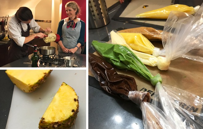 First up were the fillings, which were each assigned to a pair of students to make for the group after Ségolène’s explanation and demonstration. One team worked on the chocolate ganache, another on a coffee-flavored buttercream, the third divided their vanilla cream recipe so that half could be made into pistachio cream and my team was assigned a fresh pineapple compote (later flavored with rum).