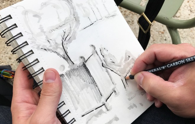 So…aside from a few local paint with wine nights at neighborhood bars, I don’t think I’ve had much of an opportunity to do “art” in the last 15 to 20 years, nor was I able to get back in the saddle prior to our trip due to a tiny distraction at home (i.e. my at the time 10-month-old son).  Luckily we got our artistic stride once we arrived in Paris, attracted to the city’s ever-inviting park benches to capture its beauty not with our iPhones but with a pencil.  Already we’re off to a good start.