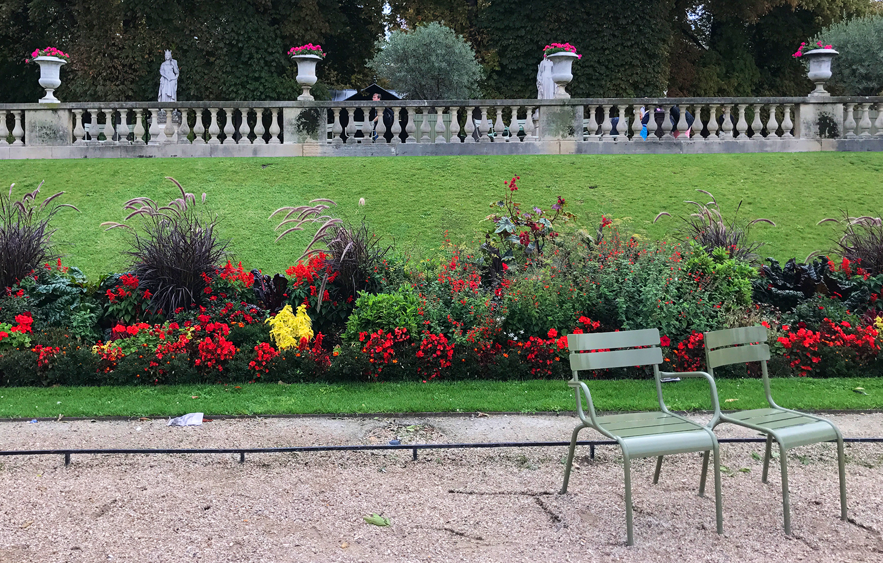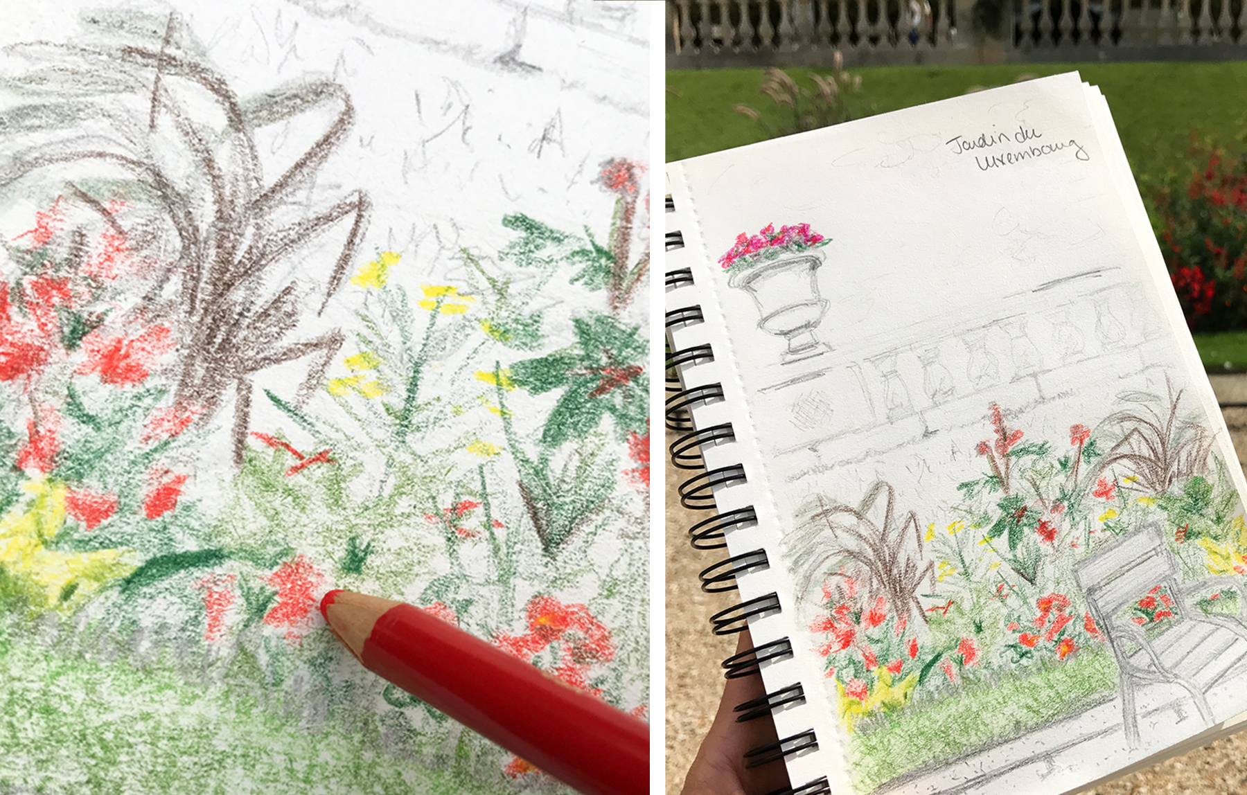 On the day of our class we met Claude promptly at 10am at the entrance to the Luxembourg gardens.  The 3 of us found a quiet area to review our sketchbooks, talking about each of our drawing styles and possible direction for the lesson. I am one of the many who swoon over the green metal chairs in Paris’ parks, so naturally this influenced where we decided to set up shop for our plein air sketching session.  Claude bounced back and forth between my husband and I, offering guidance over our shoulders and encouraged us to experiment with new materials and techniques.  Our 2 hours with her flew by to say the least, and we lingered in the park even longer to put the finishing touches on our work.  Voilà!