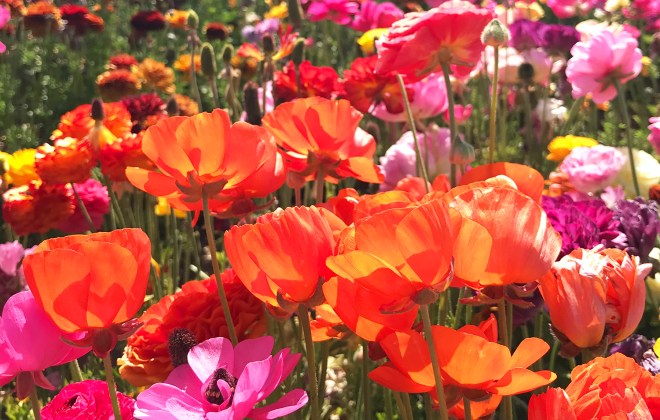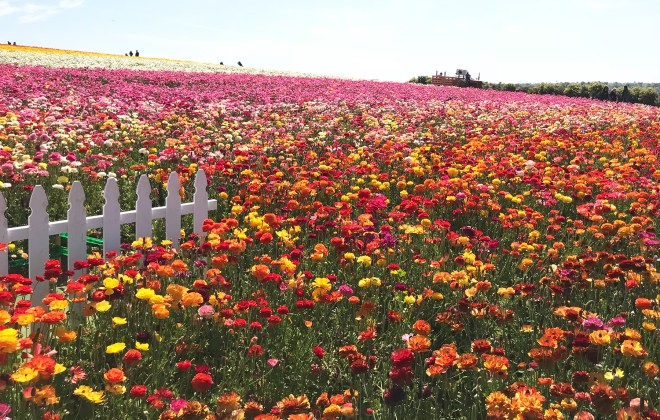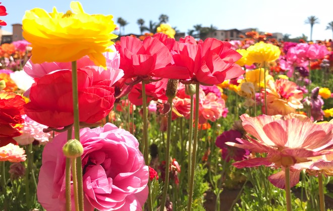 Springtime adds a certain amount of magic to travel as warmer temperatures and longer days have a way of breathing new life into a city. I’ve experienced this first hand in Paris (c’est la vie), the Netherlands (all those tulips!) and most recently in Southern California at the Flower Fields at Carlsbad Ranch. Talk about Mother Nature’s flower power at its finest, the Flower Fields burst with thousands of technicolor ranunculus in bloom from March through mid-May each year. And even though our visit was at the tail end of the season, there definitely was no shortage of flowers to see. Here’s what you need to know so you can start dreaming about a visit next year.