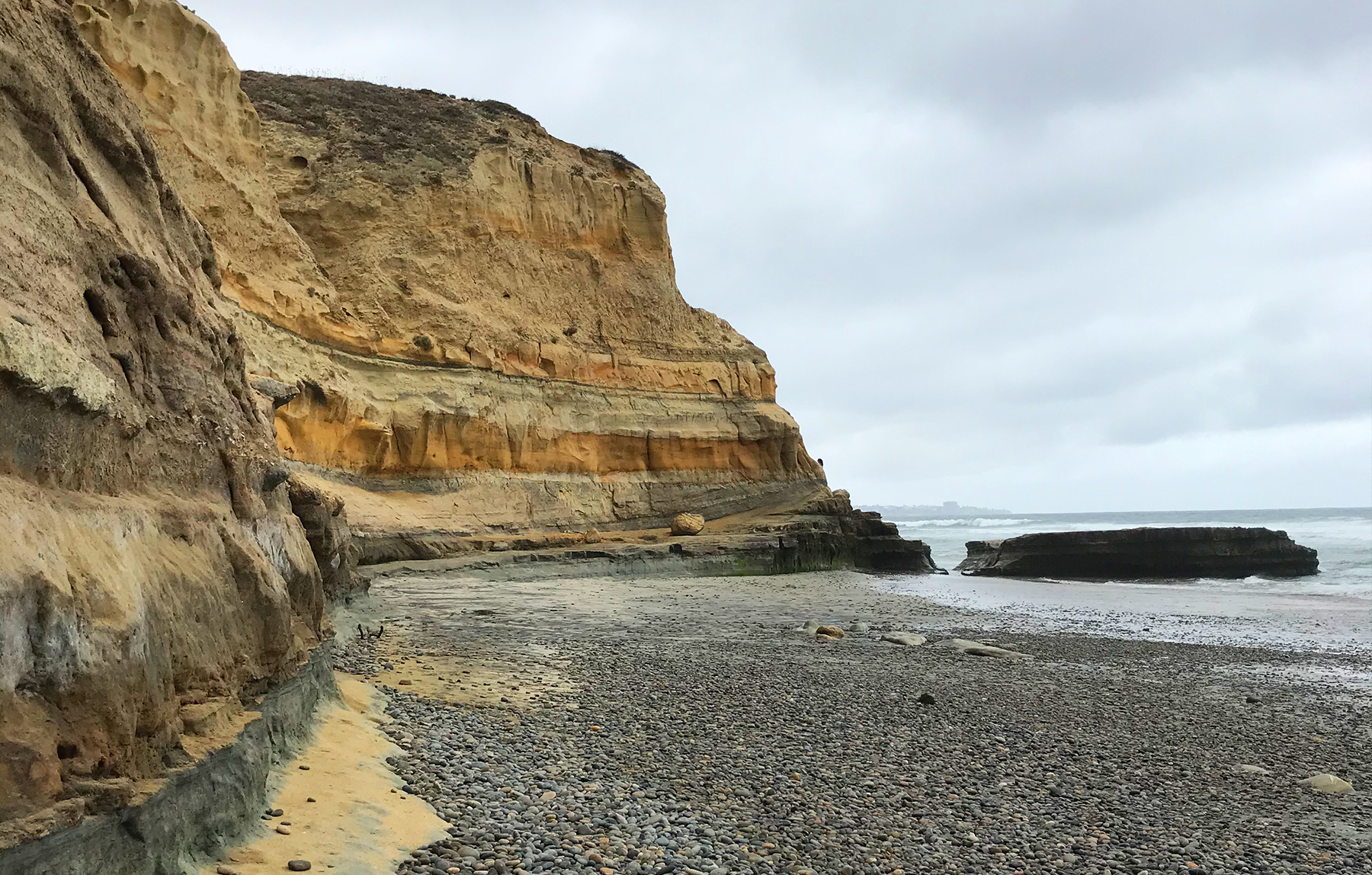 Surrounded by towering cliffs with Flat Rock in the distance, we took in the vastness of the stormy sky and rushing waves before rejoining the trail and hiking back to the parking lot. This scene – a raw sliver of the powerful forces of nature that have shaped this area for centuries – was the perfect way to end our hike at Torrey Pines, leaving us with much anticipation of returning again in the future.