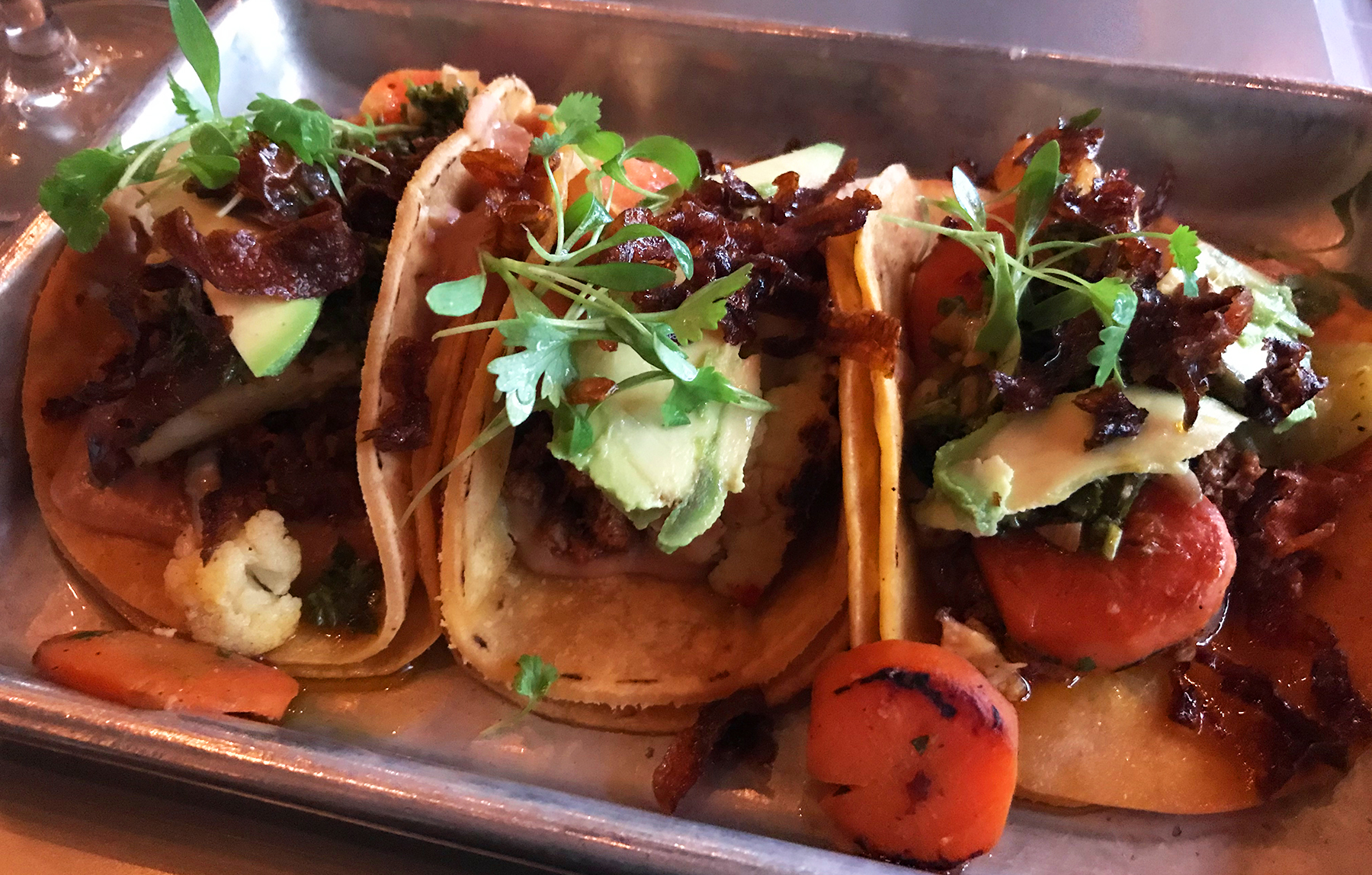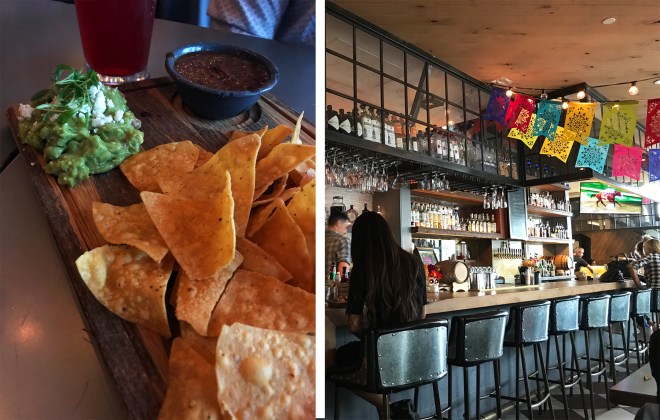 The cuisine is Mexican standards with a fresh and modern twist, like the chips and guac we started with that was served on a wooden board with smoky tomato salsa.  We followed this with an order of the roasted veggies tacos (pinto beans and an assortment of vegetables in sweet potato tortillas) and the seafood trio (featuring one each of fish, octopus and shrimp).  With both dishes, each ingredient right down to the garnish was given the opportunity to shine, creating delicious flavor combinations as a result.  Even better, this is another place with great weekly specials on food and drinks (Taco Tuesday anyone?) that are fit for a king or a queen.