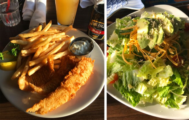 The menu is well-rounded, offering more than just seafood with options ranging from shredded pork tacos to vegetable pomodoro.  Case in point, our order included fish and chips and a cobb salad, along with beer and wine and the “bread upon request”, which I highly recommend you do not pass up.  The bread was actually rolls, still warm and steaming from the oven with a fluffy inside, hint of sourdough flavor and a crispy bottom as if they were baked in a cast iron pan.  The San Diego Pier Cafe is not as casual as its name implies, but comes with a relaxing ambiance, friendly service and is in a great spot for a post-dinner walk along the waterfront.