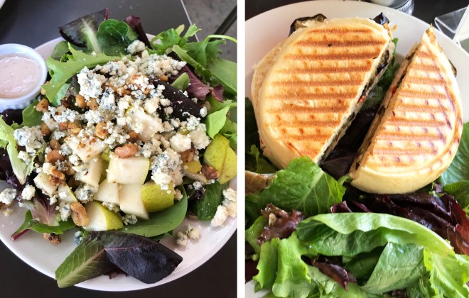 Coronado Island is only 15 minutes away from Downtown by car or ferry, and a lovely spot for a leisurely lunch is Tartine.  This European style café is a short walk from the ferry landing and serves up delicious grilled panini sandwiches and salads and hard-to-resist bakery creations/rooted in fresh ingredients.  We ordered one of each – the grilled eggplant panino with roasted red peppers and warm goat cheese and mixed spring greens salad that was topped with pears, gorgonzola, walnuts and a crunchy baguette on the side – and wish we would have saved room to try one (or some) of Tartine’s hard-to-resist bakery creations.  The restaurant offers both indoor and outdoor patio seating, and a dinner menu with a twist on bistro favorites in the evenings.