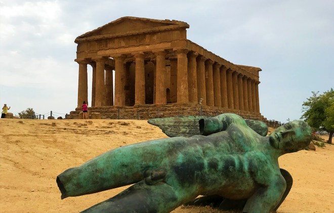 The park is divided into Eastern and Western zones that encompass a collection of seven Doric-style temples and a necropolis set amongst vast blue skies and olive trees. The star attraction is the Temple of Concordia, which in and of itself is one of the best-preserve temples in existence due to reinforcements that were put in place when it was converted to a Christian basilica in the 6th century. Today it stands at the end of the main road towards the eastern end of the park, flanked by a fallen bronze statue of Icarus, the figure in Greek mythology who dared to fly too close to the sun. Other temples are dedicated to Juno, Hercules, Castor and Pollux (Dioscuri), Vulcan, Asclepius and Olympian Zeus.