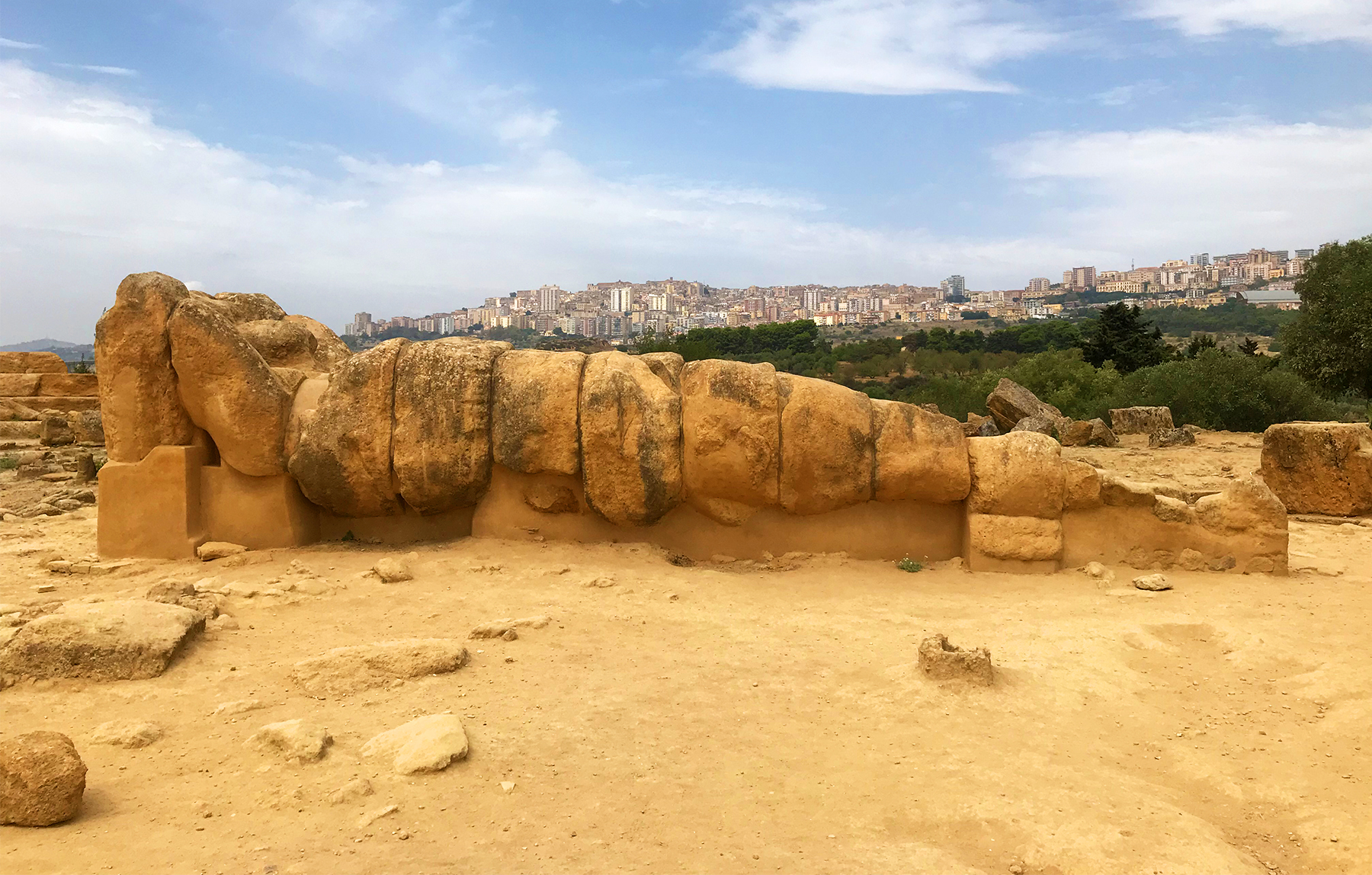 The Temple of Olympian Zeus is perhaps the most evocative area in the park, which to me felt as if we were walking through a graveyard of toppled stones and columns surrounding the temple. It was built to celebrate Akragas’ victory over the Carthaginians and ranks among the largest Doric temples ever built. You can get a sense of its size and scale by the male telamon statues that were intended to support the structure (the female equivalent were called caryatids, a prime example being the Erechtheion at the Acropolis). There were 38 of these in total, each comprised of 12 stacked blocks measuring 8 meters (26 feet) tall that would have stood on the outside of the temple in between each of its columns. Today these statues are like sleeping giants, still lying where they had fallen centuries ago.