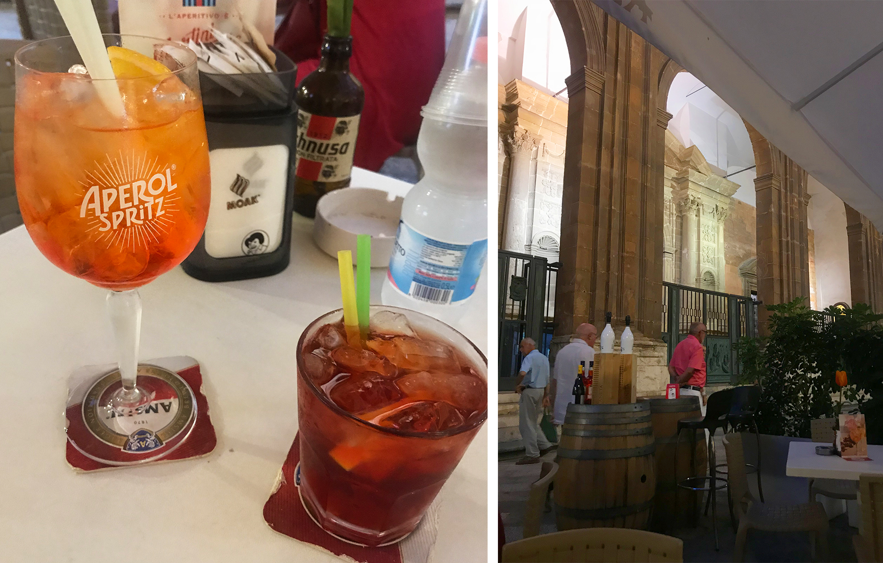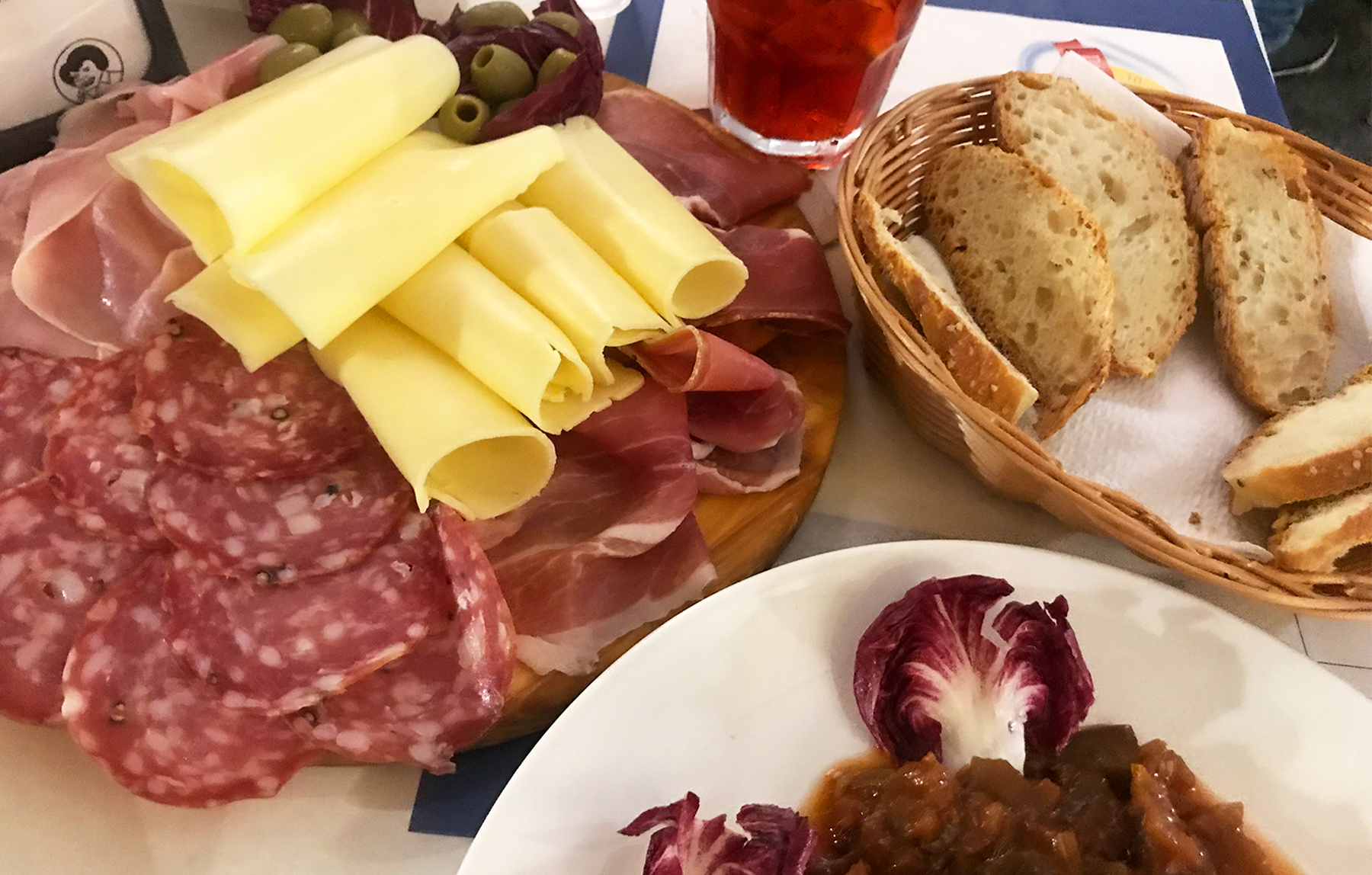 We spent our last day in Sicily on the Egadi Islands and were looking for a quick and easy meal before our drive home from Trapani. After walking around the city center we settled into Sorsi e Morsi along the main pedestrian street Via Corso Vittorio Emanuele. This casual wine bar is situated directly across from the San Lorenzo cathedral and seemed to attract a mixture of local “regulars” and tourists alike. We started with a much-needed aperitivo (an Aperol Spritz and a Negroni) followed by the antipasti platter that was advertised on the street side menu board. Our “light” meal turned out to be a gigantic party-sized tray that included 3 types of meat, cheese and olives, which along with the eggplant caponata we ordered, felt like enough food to feed a small army (or at least 6 more people).