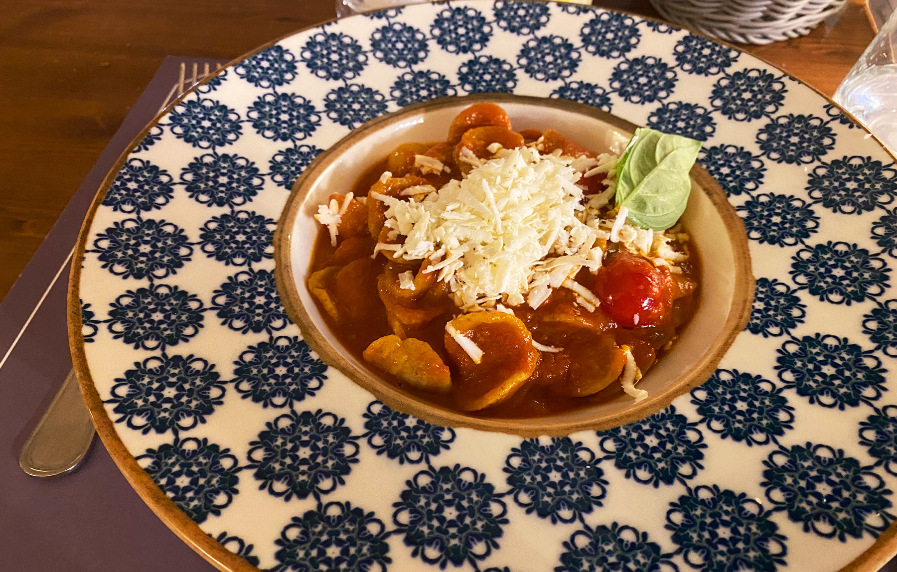 We were presented with a complimentary bruschetta starter as we browsed the menu, a touchless experience thanks to the free wi-fi and QR code at the table that we scanned to view on our phone. Martina Franca is famous for its capocollo, so naturally we ordered this as our antipasto along with the soft and slightly salty caciocavallo cheese that’s also typical of the region, along with an insalata mista. The signature pasta shape in Puglia is orecchiette, so I couldn’t pass up an opportunity to order the orecchiette pomodoro e cacio at Ristorante Garibaldi. The sauce was incredible, smooth and rich with just the right amount of salt and acidity, and stood out as arguably one of the best-tasting sauces I’ve ever had. My husband’s paccheri bistrot with fried eggplant and smoky scamorza cheese was also delicious, or so I hear as I was preoccupied savoring my own dish. Wonderful food combined with the ambiance of the floodlit piazza and church, made for an all-around wonderful night.