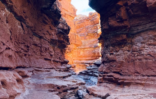 Just over the state line in the Glen Canyon National Recreation Area, Wiregrass Canyon is another beautiful trail that’s only a 35-minute drive from Page in Kanab, Utah. From the turn off at Big Water, follow the gravel road where you may see people on dirt bikes or dune buggies in the open space between the dramatic cliffs and hills scattered with fallen rocks so large that everything else seems to be in miniature. The first part of the trail is relatively flat but after about the first half mile you will encounter some steep drops, which would be manageable if they weren’t filled with water on the day of our hike. There’s an alternative path that goes up and over to the left (look for the cairns to help guide you) that allows you to skirt the deep parts of the canyon and connect back with the trail more gradually. The trail is roughly 6 miles round trip depending on how far you walk into the canyon before turning back and can be considered easy to moderate in difficulty with changing scenery as you travel along the sandy wash through narrow passages and some areas that require scrambling.