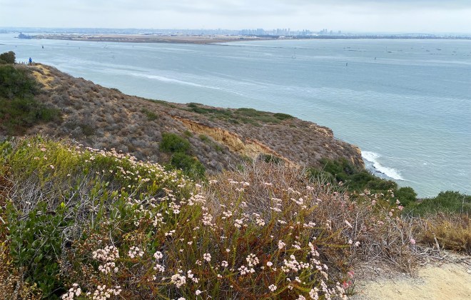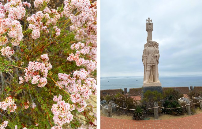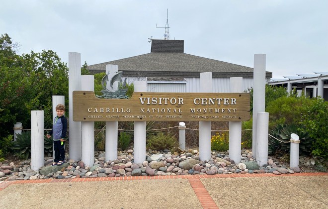 Another distinguishing feature of Cabrillo National Monument is its natural environment and one of the best ways to experience this is on the Bayside Trail. The trail is about 2 miles round trip and follows an old U.S. Army roadway through a wild landscape of coastal sage scrub, succulents, flowers and grasses. Benches are perfectly placed along the trail to take in the scenery and sweeping views, with informational signage about the natural and militaristic significance of the area and remnants of coastal defense systems that helped protect the harbor during WWII. It’s a relatively easy trail that’s suitable for all ages and abilities that’s mostly flat or downhill on the way out with a slight incline on the return.