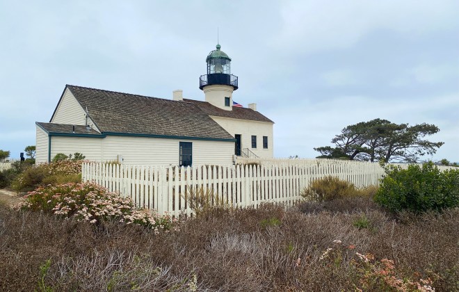 Continue along the paved path to the Old Point Loma Lighthouse. The lighthouse was originally built in the 1850s and was among the first lighthouse on the west coast constructed by the U.S. government. At one time it was the highest lighthouse in the country at 422 feet above sea level and its position at the tip of Point Loman meant it could be seen from both the ocean and the bay. It remained operational for only 36 years as low hanging clouds and fog often obscured its light, thus a new lighthouse was eventually built at the bottom of the hill. Go inside the lighthouse up its narrow spiral staircase to see reconstructions of rooms that depict how the lighthouse keeper lived. The adjacent building was once the Assistant Lighthouse Keepers Quarters with a wealth of information about lighthouse technology and the demanding job of the keepers. Also nearby is the whale overlook and a military history exhibit that digs deeper to the area’s strategic position.