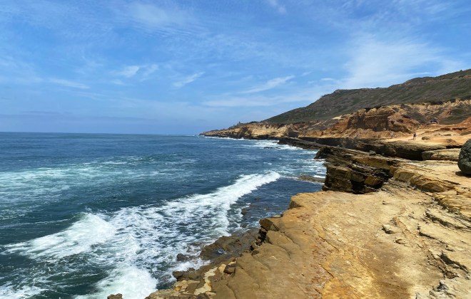 A short drive away from the Visitor Center is a separate parking area for access to the Point Loma Tidepools. It’s a fun spot for adults and kids alike to partake in a nautical scavenger hunt on the coastal side of the Cabrillo National Monument. There’s also a short 1-mile round trip Coastal Trail that extends from the parking lots. Despite the sign that said the tides were too high on the day of our visit, we still managed to find a plethora of sea grasses, crabs and other tiny creatures clinging to crevices so as not to get swept out to sea as the tide washed in and out. We were also treated to beautiful coastal views from the higher vantage points of the sandstone cliffs that overlooked the deep blue ocean and foamy waves below.