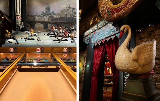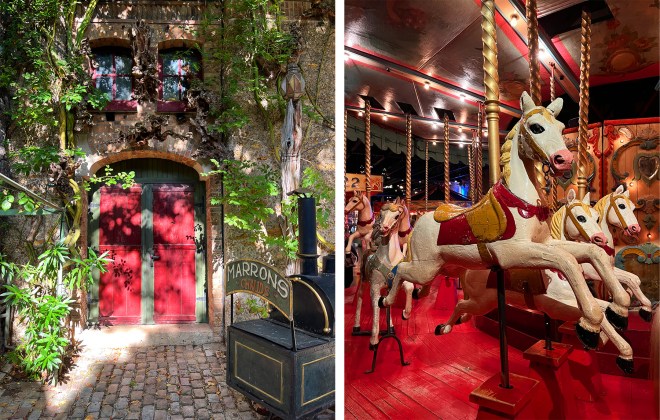 A visit to the Musée des Arts Forains is only available by guided tour (and often only in French), which can be hard to come by if you don’t plan in advance.  But if you are lucky enough to experience this incredible place, prepare to be swept away literately and figuratively to a world of wonder and amazement.  We were greeted by our lively guide in an outside area marked with cobbled lanes, lush trees, a crystal chandelier and other whimsical curiosities strewn about.  He shared fascinating stories about the history of the objects that surrounded us as he led us through a series of beautiful spaces draped in red velvet curtains, glittering lights and a treasure trove of still-working carousels, carnival games and other artifacts of amusement.  What made this immersive experience even more memorable was that we were able to dance to the music of a 19th century organ, compete in a vintage game of skee-ball and even ride on several of the turn of the century carousels.