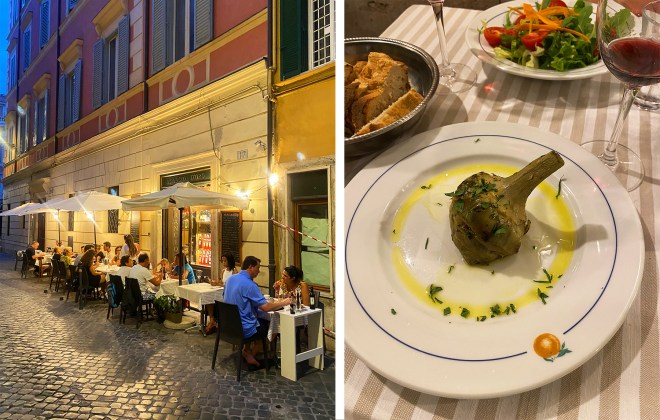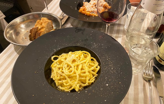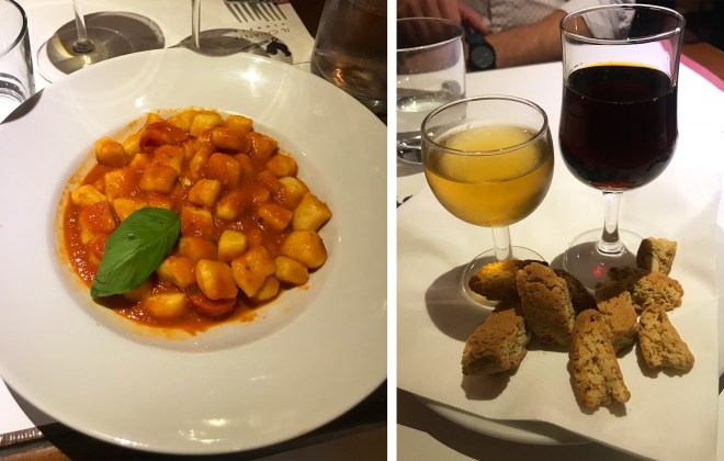 We started with house red wine, an insalata mista and a delicious Roman-style artichoke, soft and tender as opposed to the crispy, deep-fried Jewish-style versions. There was only one waiter attending to all of the tables so our meal progression was a bit slow but soon enough our pasta dishes arrived – cacao e pepe and fusseli with eggplant, the latter which reminded me of Sicily’s signature Pasta alla Norma. Both were delicious and surprisingly not filling, a good thing since it was already much later than we would typically eat in Italy. We ended the meal with a caffé that was delivered to us with a smile and large plate of biscotti, which we happily enjoyed under the street lights.