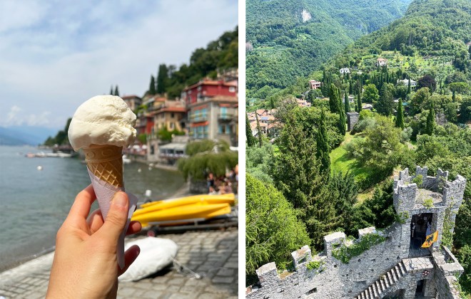 As we were leaving the villa, the sun emerged as did the crowds, the narrow streets and waterfront eateries now teaming with people. We browsed the shops a bit and then grabbed a gelato at Bar Il Molo, which leads to tip #3 – never pass up an opportunity for gelato, especially when doing something hot or strenuous or both. That would come next, as we made the trek up to the 11th century Casetllo di Vezio via a path from the northern part of town, which we might have skipped if we had known just how steep and slippery the climb would be straight up the stony path. It’s a 20 minute walk, we thought. Yes, but castles are high up so what we saved in time we more than paid for in incline. Sweaty and exhausted, we explored the towers of the medieval fortification, which offered a beautiful viewpoint high above Lake Como, along with exhibits of armor and “ghosts” keeping watch over the castle’s olive grove. Afterwards we headed back down via dirt path along the Sentiero del Viandante hiking route, which ended up being a better alternative for our decent and dropped us off near the parking garage across from villa Monastero.