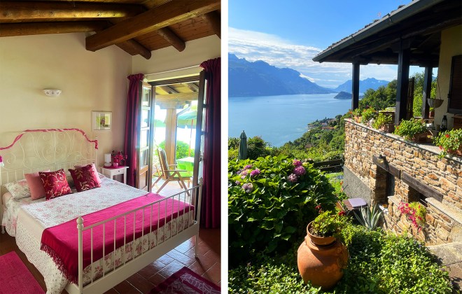 After an incredible 4 days of hiking in Switzerland’s scenic Lauterbrunnen Valley, we drove across the Swiss border via Lugano. It was instantly clear we had entered Italy, from the demeanor of the officer at the crossing, the bronzed bodies walking along the street and colorful apartment buildings draped with pink bougainvillea. We soon arrived at the lovely B&B Le Eriche, a sweet 2-room B&B run by Piero and Fiametta that’s less than 10 minutes up the windy road from Menaggio with gorgeous views. We were welcomed by Fiametta, who led us to our cute-as-a-button pink Camelia room with a spacious bathroom, small kitchen area and doors that opened to our private patio above the lush green garden and incredible views overlooking Lake Como. It felt as if we were staying with a distant relative, rather than at a hotel in an upscale destination.
