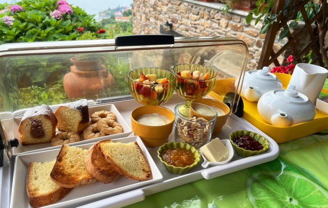 The next morning we got up early and were treated to a traditional Italian breakfast on our patio, consisting of coffee, juice, toast with jam and butter, cereal, fruit topped with just-picked mint from garden and an assortment of cookies and cake, which was staged and served by Fiamatta with precision and care.